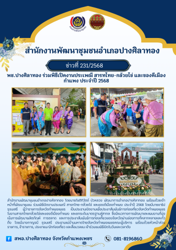 สำนักงานพัฒนาชุมชนอำเภอปางศิลาทอง โดยนายโชติทิวัตถ์ บัวหลวง พัฒนาการอำเภอปางศิลาทอง พร้อมด้วยเจ้าหน้าที่พัฒนาชุมชน ร่วมพิธีเปิดงานประเพณี สารทไทย-กล้วยไข่ และของดีเมืองกำแพง ประจำปี 2568 โดยมีนายชาธิป รุจนเสรี ผู้ว่าราชการจังหวัดกำแพงเพชร เป็นประธานเปิดงานเพื่อประชาสัมพันธ์การท่องเที่ยวจังหวัดกำแพงเพชร ในงานสารทไทยกล้วยไข่และของดีเมืองกำแพง และยกระดับมาตรฐานสู่สากล ซึ่งมีแนวทางการพัฒนาและแผนงานที่มุ่งเน้นการพัฒนาผลิตภัณฑ์ การตลาด และการประชาสัมพันธ์การท่องเที่ยวของจังหวัดผ่านช่องทางที่หลากหลายและทั่วถึง โดยมีนางกาญจนี รุจนเสรี ประธานแม่บ้านมหาดไทยจังหวัดกำแพงเพชรคณะผู้บริหาร พร้อมด้วยหัวหน้าส่วนราชการ, ข้าราชการ, ประชาชน/นักท่องเที่ยว และสื่อมวลชน เข้าร่วมชมพิธีเปิดในวันและเวลาดังกล่าว