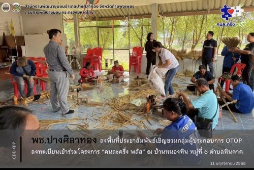 สำนักงานพัฒนาชุมชนอำเภอปางศิลาทอง โดยนายโชติถิวัตถ์ บัวหลวง พัฒนาการอำเภอปางศิลาทอง พร้อมเจ้าหน้าที่พัฒนาชุมชนอำเภอ ลงพื้นที่ประชาสัมพันธ์เชิญชวนผู้ประกอบการ OTOP และกลุ่มอาชีพในชุมชน ลงทะเบียนเข้าร่วมโครงการ “คนละครึ่ง พลัส” ซึ่งเป็นโครงการส่งเสริมเศรษฐกิจชุมชน สนับสนุนการจำหน่ายสินค้าและบริการของผู้ประกอบการรายย่อย โดยในครั้งนี้ได้ลงพื้นที่ประชาสัมพันธ์ ณ กลุ่มอาชีพบ้านหนองหิน หมู่ที่ 6 ตำบลหินดาต กลุ่มผู้ผลิตไม้กวาดดอกหญ้าคุณภาพที่สร้างรายได้แก่สมาชิกในพื้นที่อย่างต่อเนื่อง พร้อมให้คำแนะนำเกี่ยวกับขั้นตอนการลงทะเบียนเข้าร่วมโครงการ และแนวทางขยายช่องทางจำหน่ายสินค้าในรูปแบบออนไลน์
