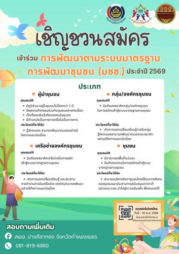 สำนักงานพัฒนาชุมชนอำเภอปางศิลาทอง ขอเชิญชวนสมัครเข้าสู่ระบบมาตรฐานการพัฒนาชุมชน (มชช.) ประจำปี 2569