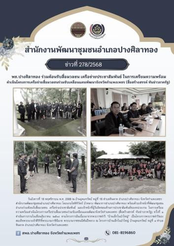 สำนักงานพัฒนาชุมชนอำเภอปางศิลาทอง โดยนายโชติทิวัตถ์ บัวหลวง พัฒนาการอำเภอปางศิลาทอง พร้อมด้วยเจ้าหน้าที่พัฒนาชุมชนอำเภอร่วมต้อนรับสื่อมวลชน เครือข่ายประชาสัมพันธ์ และเจ้าหน้าที่ผู้รับผิดชอบด้านการประชาสัมพันธ์ของหน่วยงาน ในการเตรียมความพร้อมดำเนินโครงการเครือข่ายสื่อมวลชนร่วมขับเคลือนแผนพัฒนาจังหวัดกำแพงเพชร (สื่อสร้างสรรค์ ทันข่าวภาครัฐ) ครั้งที่ ๑ ดำเนินการภายในเดือนธันวาคม ๒๕๖๘ ตามโครงการอันเนื่องมาจากพระราชดำริ "บ้านเล็กในป่าใหญ่" เป็นโครงการพระราชดำริของสมเด็จพระนางเจ้าสิริกิติ์พระบรมราชินีนาถ พระบรมราชชนนีพันปีหลวง ณ โครงการบ้านเล็กในป่าใหญ่ บ้านอุดมทรัพย์ หมู่ที่ ๘ ตำบลหินดาต อำเภอปางศิลาทอง จังหวัดกำแพงเพชร