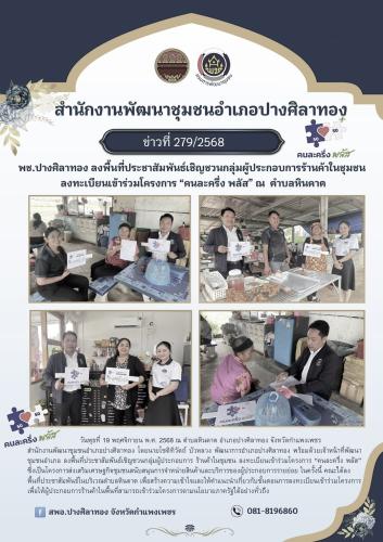 สำนักงานพัฒนาชุมชนอำเภอปางศิลาทอง โดยนายโชติทิวัตถ์ บัวหลวง พัฒนาการอำเภอปางศิลาทอง พร้อมด้วยเจ้าหน้าที่พัฒนาชุมชนอำเภอ ลงพื้นที่ประชาสัมพันธ์เชิญชวนกลุ่มผู้ประกอบการ ร้านค้าในชุมชนลงทะเบียนเข้าร่วมโครงการ “คนละครึ่ง พลัส” ซึ่งเป็นโครงการส่งเสริมเศรษฐกิจชุมชนสนับสนุนการจำหน่ายสินค้าและบริการของผู้ประกอบการรายย่อย ในครั้งนี้ คณะได้ลง พื้นที่ประชาสัมพันธ์ในบริเวณตำบลหินดาต เพื่อสร้างความเข้าใจและให้คำแนะนำเกี่ยวกับขั้นตอนการลงทะเบียนเข้าร่วมโครงการ เพื่อให้ผู้ประกอบการร้านค้าในพื้นที่สามารถเข้าร่วมโครงการตามนโยบายภาครัฐได้อย่างทั่วถึง
