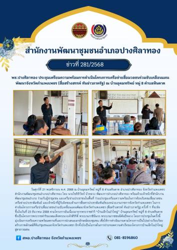 สำนักงานพัฒนาชุมชนอำเภอปางศิลาทอง โดย นายโชติทิวัตถ์ บัวหลวง พัฒนาการอำเภอปางศิลาทอง พร้อมด้วยเจ้าหน้าที่พัฒนาชุมชนอำเภอ ร่วมกับผู้นำชุมชนและเครือข่ายในพื้นที่ ร่วมประชุมเตรียมความพร้อมในการต้อนรับคณะสื่อมวลชน เครือข่ายประชาสัมพันธ์ และเจ้าหน้าที่ผู้รับผิดชอบด้านการสื่อสารประชาสัมพันธ์ของหน่วยงานราชการจังหวัดกำแพงเพชร ในการดำเนินโครงการเครือข่ายสื่อมวลชนร่วมขับเคลื่อนแผนพัฒนาจังหวัดกำแพงเพชร (สื่อสร้างสรรค์ ทันข่าวภาครัฐ) ครั้งที่ 1 ที่จะจัดขึ้นในวันที่ 23 ธันวาคม 2568 ตามโครงการอันเนื่องมาจากพระราชดำริ “บ้านเล็กในป่าใหญ่” บ้านอุดมทรัพย์ หมู่ที่ 8 ตำบลหินดาต ซึ่งเป็นโครงการพระราชดำริของสมเด็จพระนางเจ้าสิริกิติ์ พระบรมราชินีนาถ พระบรมราชชนนีพันปีหลวง โดยการประชุมในครั้งนี้มุ่งเน้นการเตรียมความพร้อมสถานที่และการนำเสนอเอกลักษณ์ของชุมชน เพื่อให้การดำเนินงานตามโครงการเป็นไปอย่างเรียบร้อย สร้างภาพลักษณ์ที่ดีแก่ชุมชนและจังหวัดกำแพงเพชร อีกทั้งยังเป็นโอกาสในการถ่ายทอดความสำเร็จของโครงการบ้านเล็กในป่าใหญ่สู่สาธารณชน