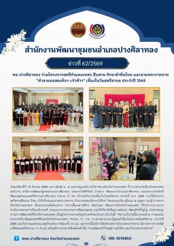 สำนักงานพัฒนาชุมชนอำเภอปางศิลาทอง โดยนายโชติทิวัตถ์ บัวหลวง พัฒนาการอำเภอปางศิลาทอง มอบหมายเจ้าหน้าที่พัฒนาชุมชนและสตรีอำเภอปางศิลาทอง จำนวน 11 คน เข้าร่วมกิจกรรมเนื่องในวันสตรีสากล ประจำปี พ.ศ. 2569 ภายใต้โครงการ สตรีสากลสืบสาน รักษา ผ้าถิ่นไทยและลายพระราชทาน "ผ้าลายขอสมเด็จฯ+เจ้าฟ้าฯ"